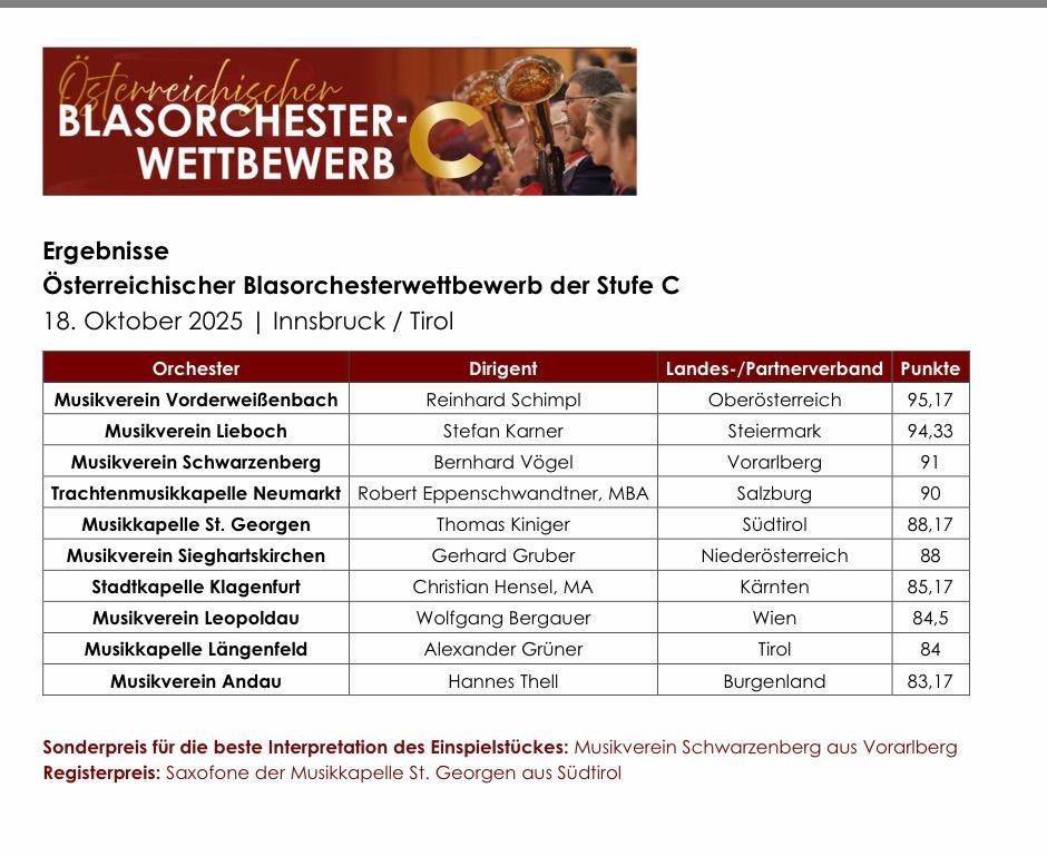 Beim Österreichischen Blasorchesterwettbewerb in Innsbruck hat die Trachtenmusikkapelle Neumarkt in der Stufe C eine beeindruckende Leistung abgeliefert und sich mit 90 Punkten den 4. Platz gesichert – ein Ergebnis, auf das Verein und Region mit Stolz zurückblicken dürfen.